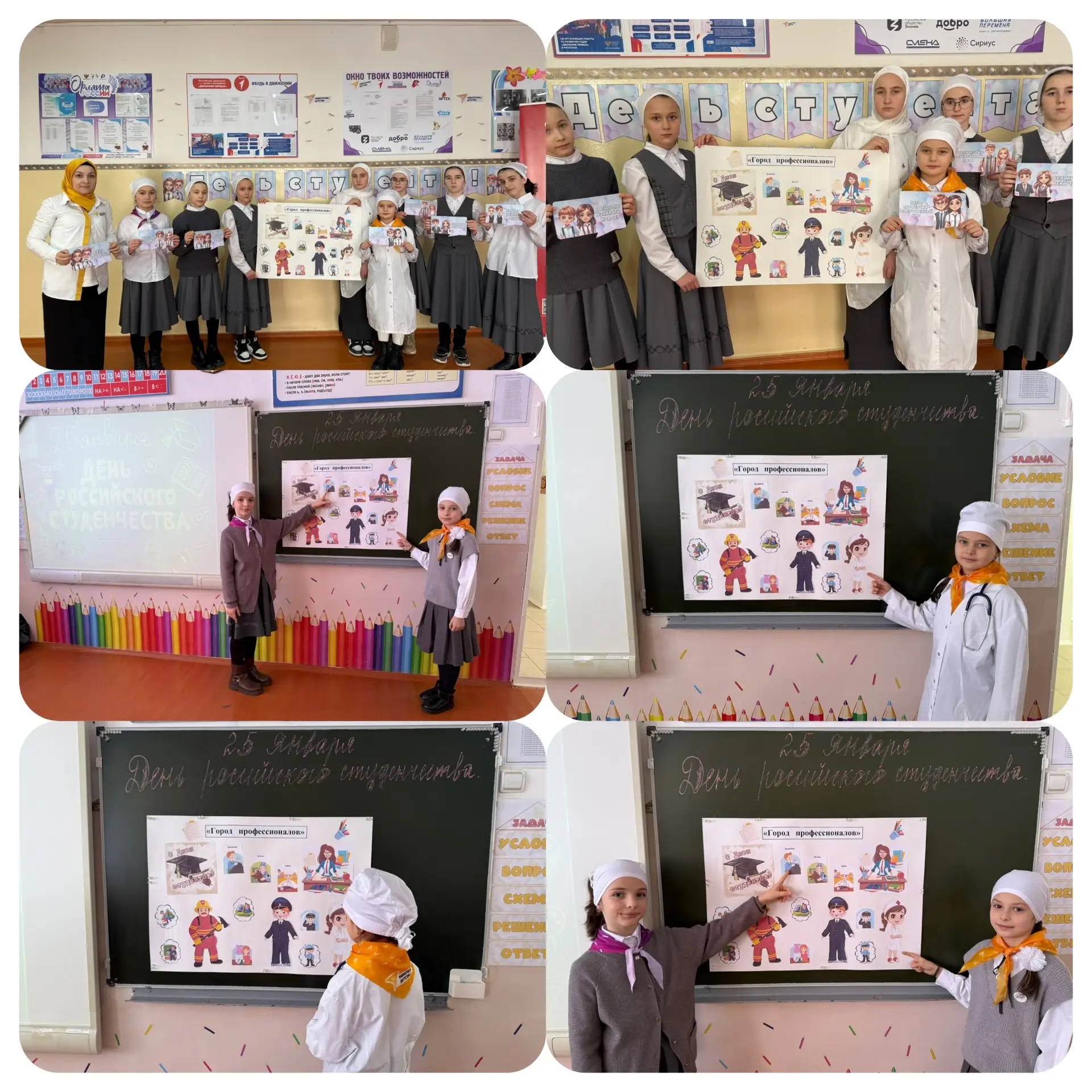 22.01.2026Классный проект «Город профессионалов» Активисты нашего первичного отделения «Движения первых» совместно с советником директора по воспитанию и взаимодействию с детскими общественными объединениями Куркаевой Ж.С. организовали удивительный проект «Город профессионалов» в рамках Всероссийской акции «Шаг в студенчество», приуроченной ко Дню российского студенчества! #ШагВСтуденчество, #ДвижениеПервых, #НавигаторыДетства, #Росдетцентр.